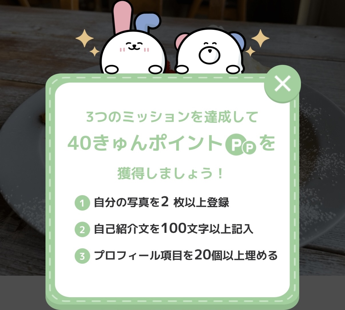 プロフィールをしっかり登録すると、アプリ内で使える40きゅんポイントがもらえます♡